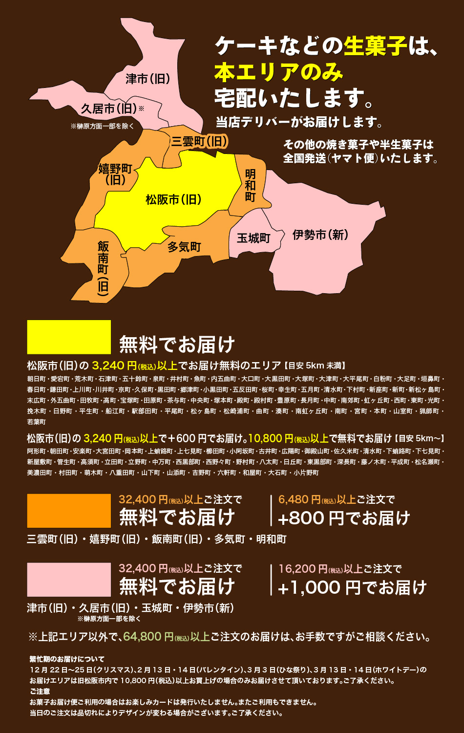 大量注文でお持ち帰りがしずらい場合にもお菓子お届け便をご用命ください。ご予算に合わせてお作り致します。